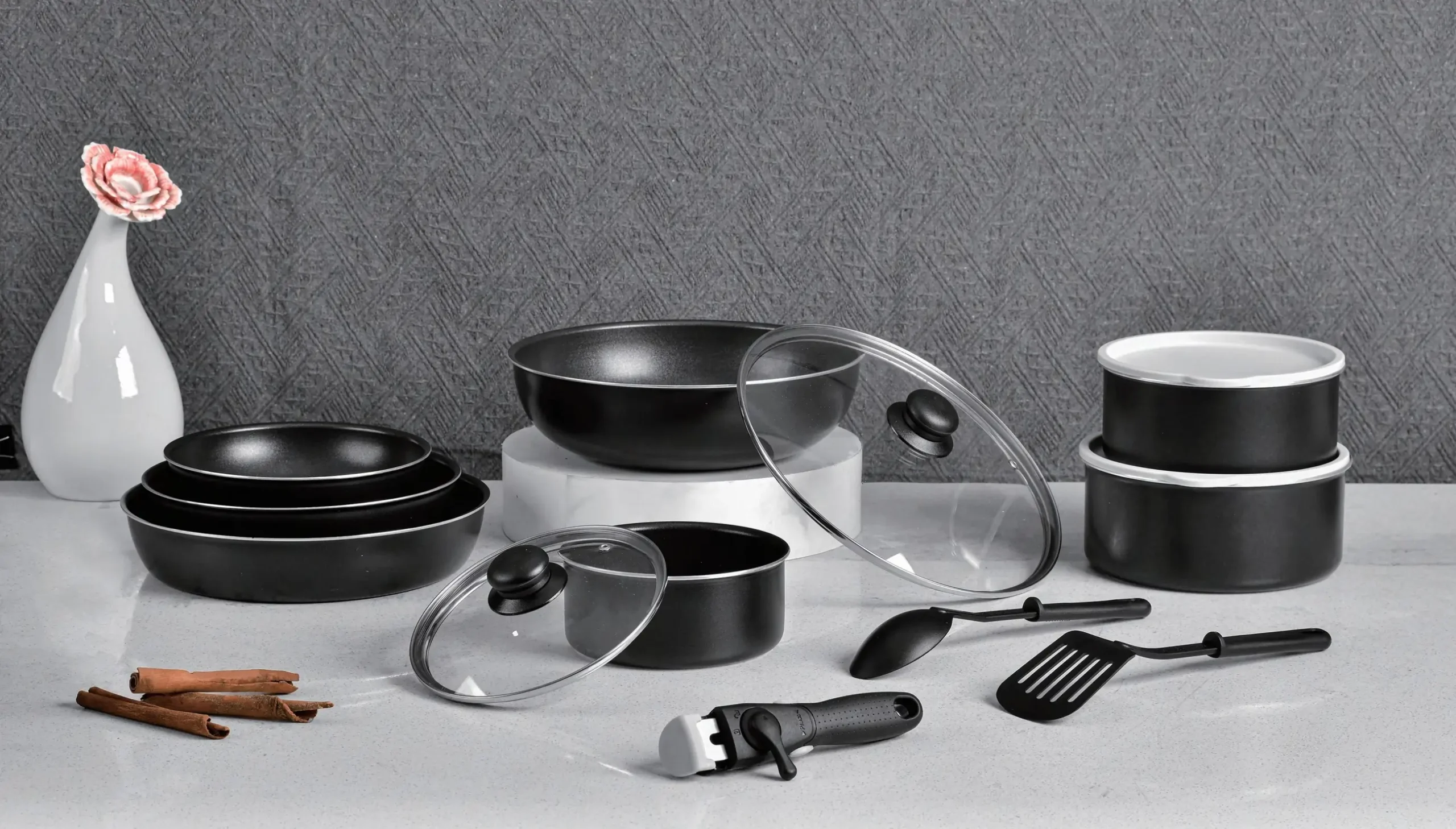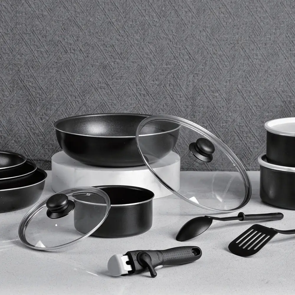 Non-Stick Aluminum Cookware Set detachable with glass lid & Cooking Spoon Interior: ceramic coating Exterior:heat resistant coating 2pcs Detachable handles and Bakelite knob with soft touch Induction bottom